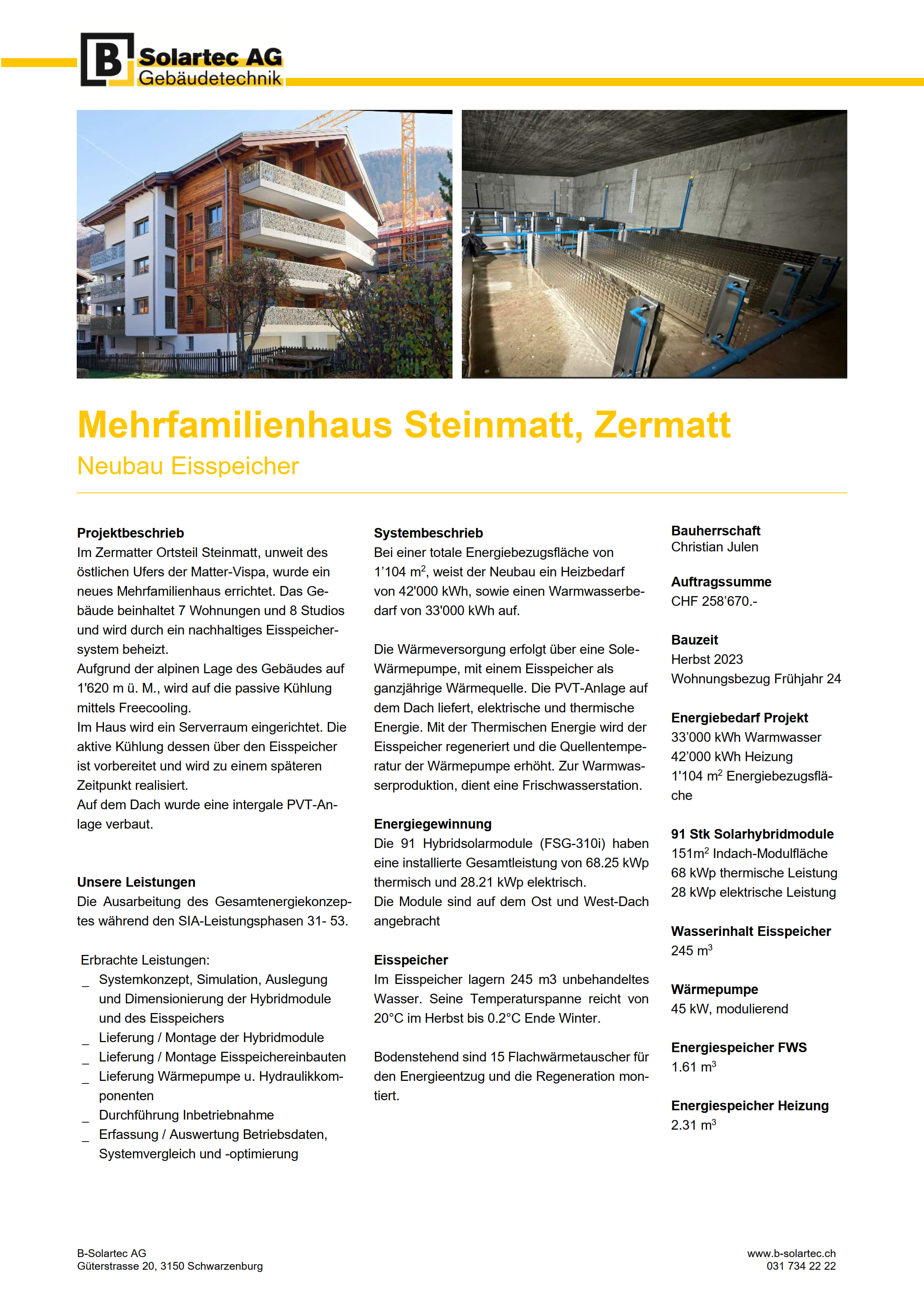 Im Zermatter Ortsteil Steinmatt, unweit des östlichen Ufers der Matter-Vispa, wurde ein neues Mehrfamilienhaus errichtet. Das Gebäude beinhaltet 7 Wohnungen und 8 Studios und wird durch ein nachhaltiges Eisspeichersystem beheizt.