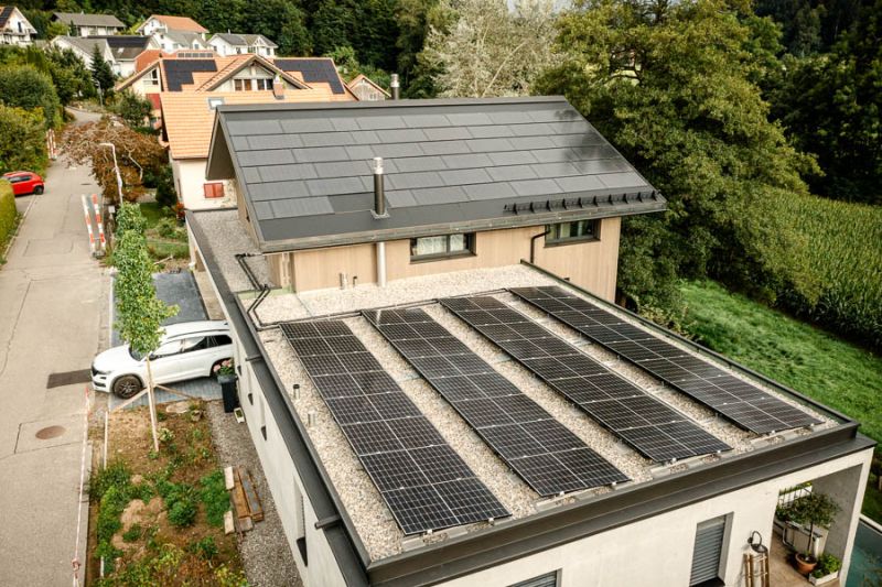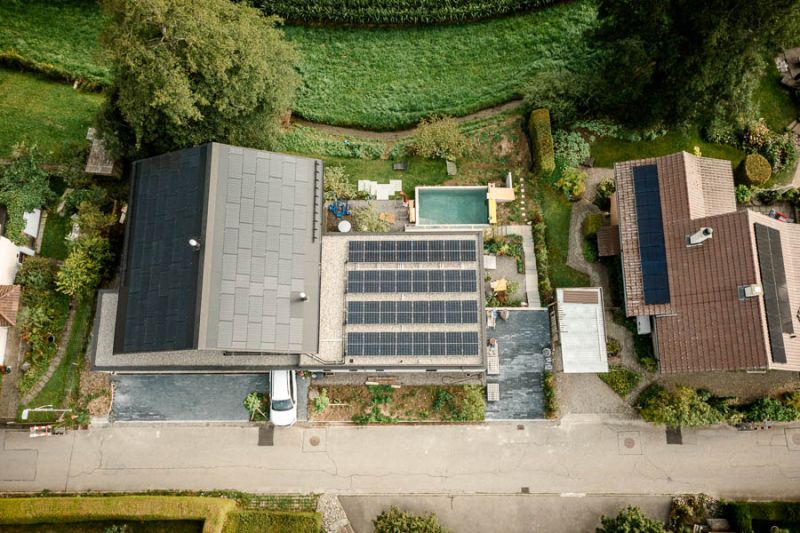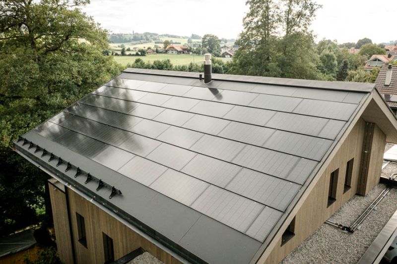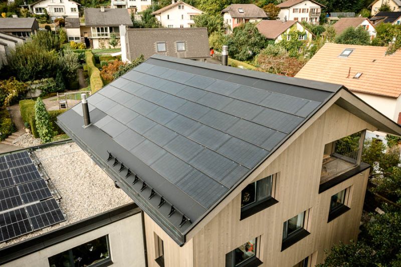 Dadurch entsteht eine erfrischend neue Optik, weg vom klassischen PV-Dach. Wenn man sich dem Gebäude nähert, nimmt man die PV Anlage erst gar nicht war. Die Optik erinnert an grossformatige Eternitplatten. Das Steildach wurde beidseitig vollflächig belegt und hat eine Leistung von 27.3 kWp.