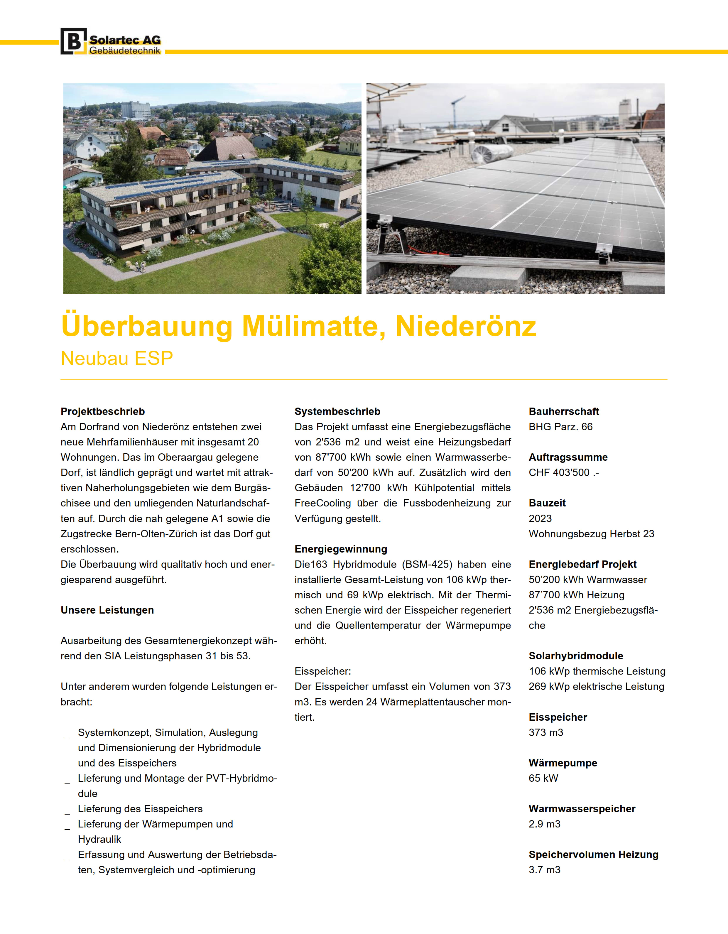 Unsere Anlage deckt den gesamten Heiz- und Kühlenergiebedarf der Überbauung ab. Das Gebäude wird ohne fossile Back-Up-Heizung realisiert. Die Energiegewinnung erfolgt über total 184 Solarhybridmodule, welche als Integral-Dach montiert sind und zusammen mit den Faserzementplatten die Dachhaut bilden. Die thermische Energie wird zur Regeneration des Eisspeichers genutzt. Der Strom speist die Wärmepumpen. Die Energiespeicherung findet im gemeinsam genutzten 420 m3 grossen Eisspeicher statt. Der Eisspeicher ist mit Rohrwendel-Wärmetauschern ausgestattet. Jedes Haus verfügt über eine eigene Wärmepumpe mit 18 kW bis 21 kW Leistung.